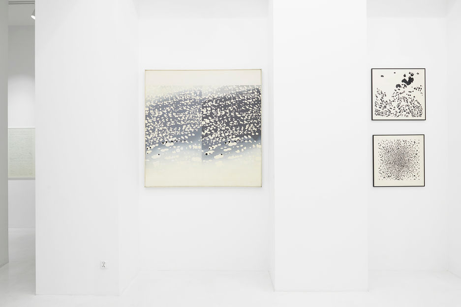 Na wystawie zostały wyeksponowane prace z cykli: Pejzaże – monochromatyczne kompozycje malarskie z lat 70. Asumptem do rozpoczęcia tego ważnego rozdziału w twórczości był przypadkowo odnaleziony w 1977 liść o wykruszonej z wysuszenia tkance. Jego forma zdawała się poświadczać, że struktury rzeczy najmniejszych z naszego najbliższego otoczenia mogą być reminiscencją bytów w skali makro. Pierwszymi pracami będącymi efektem wzmiankowanego odkrycia były Pejzaże malowane w latach 1977–1985. Na cykl składało się ponad dwadzieścia prac. Na pierwszych z nich pojawiały się rozmaicie skadrowane fragmenty liścia. Prace te, podobnie jak i późniejsze, tworzone były farbami akrylowymi na płótnie o zuniwersalizowanym formacie 146 × 146 cm. Prace te zniszczyła sama artystka, najprawdopodobniej z powodów ekonomicznych i panujących podówczas niedostatków materiałów plastycznych. W kolejnych już pracach Hałat multiplikowała nieregularne kształty zbliżone do koła i owalu, będące reminiscencją otworów i dziurek w wyschniętej materii [3]. Wychodząc od analizy otaczającego świata, dokonała syntezy tego, co dostępne dla oka i zamknęła w prostych kształtach. Płótna wydają się monochromatyczne i dalekie od różnorodności form i feerii barw obecnych w przyrodzie. Jednak przy dokładniejszym oglądzie powierzchnia zachwyca wielością odcieni, zaś niektóre z kształtów ujawniania się dopiero z bardzo bliska lub po spoglądaniu na płótno pod odpowiednim kątem.